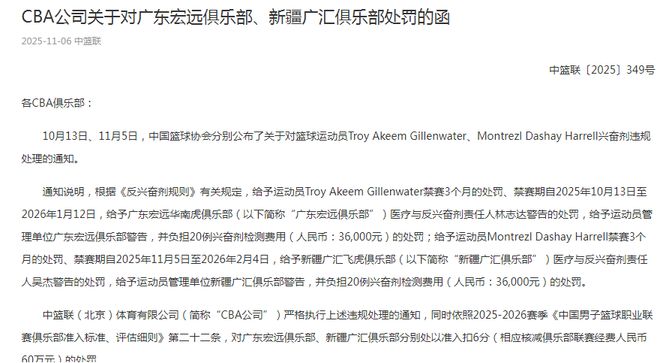 中国篮协在10月13日与11月6日,分别公布对于吉伦沃特与哈雷尔的处罚,两人均是兴奋剂违规成立,均被禁赛三个月,且广东宏远男篮与新疆广汇男篮分别承担20例兴奋剂检测费用为36000元。
