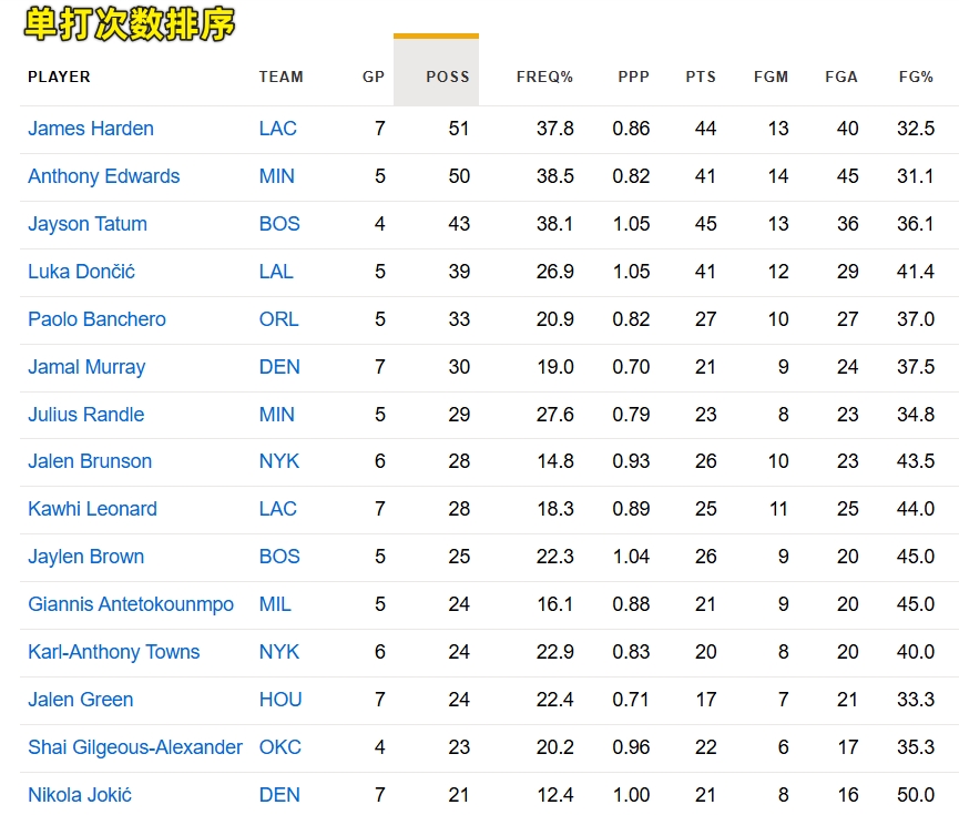 季后赛首轮单打次数最多的是哈登,一共打了51次,爱德华兹50次第二、东契奇39次第四,但哈登每次单打只能拿到0.86分,效率在上榜的33人中排名中游。