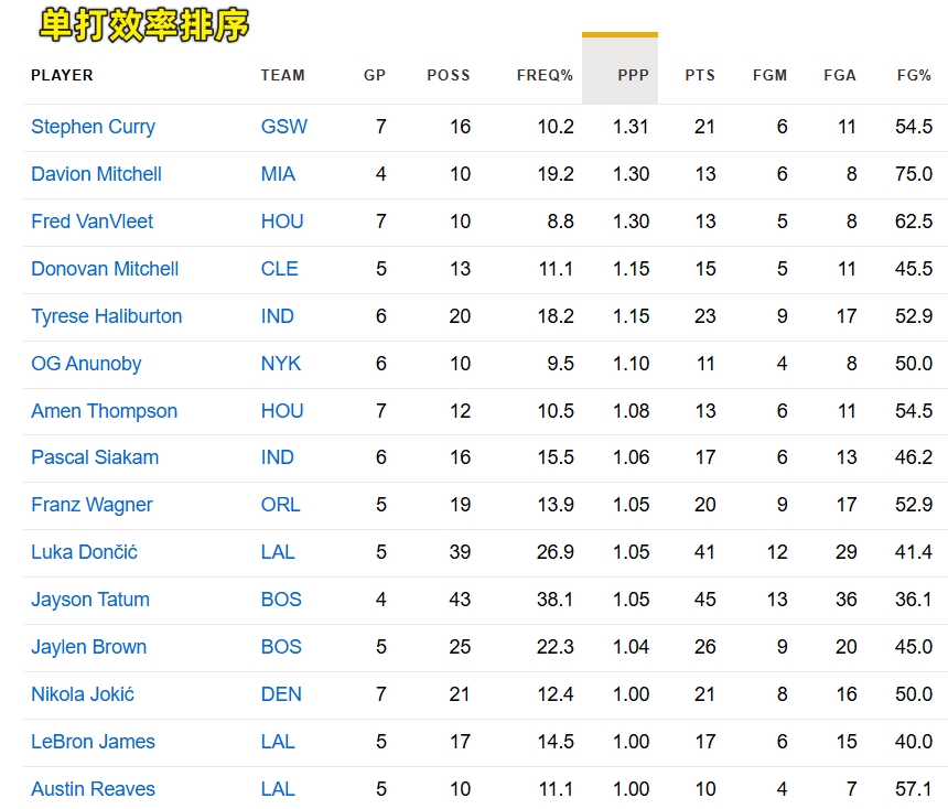 05月06日报道 NBA官方数据统计,库里在首轮7场比赛中获得了16次单打的机会,平均每次单打可以拿到1.31分,为联盟最高,第二是戴维恩-米切尔和范乔丹的每次1.30分。