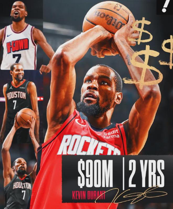 据报道,杜兰特跟火箭签下了2年9000万美元的提前续约合同,其中第2年是球员选项。