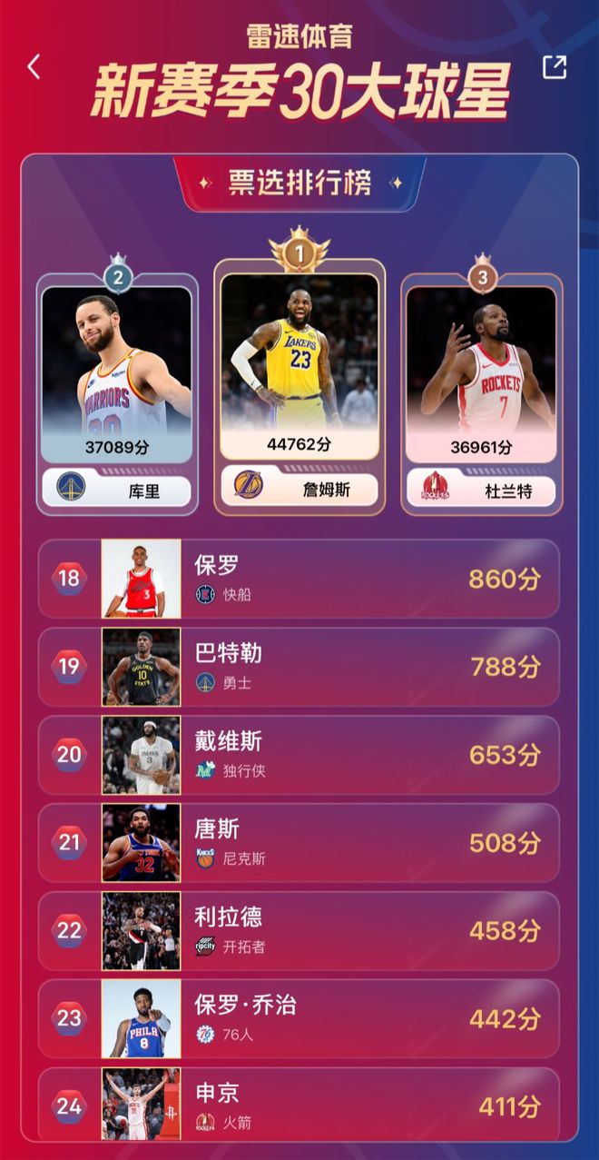 雷速体育10月20日讯 雷速NBA新赛季30大球星活动的第二阶段的竞争已经进入收官阶段,活动就于今日下午14点正式结束。