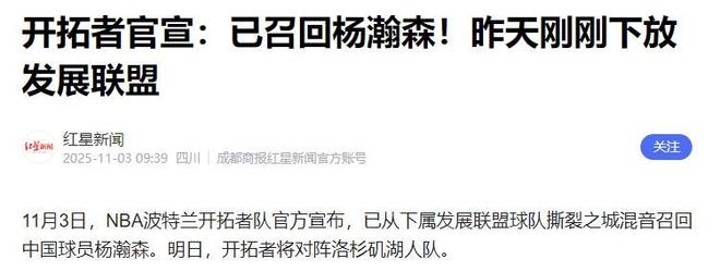11月2日,开拓者官方突然宣布:将中国新秀中锋杨瀚森下放至发展联盟附属球队混音队。