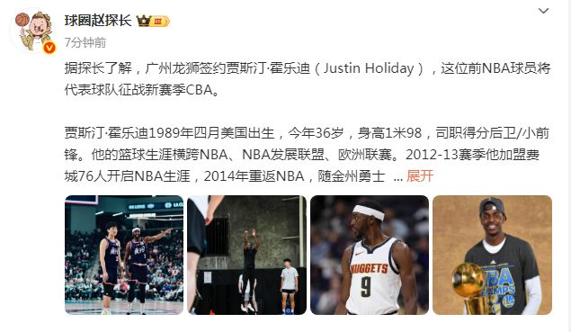 北京时间11月6日,根据媒体人球圈赵探长报道,广州男篮签约36岁的前勇士总冠军球员贾斯汀-霍勒迪,他今夏已经代表广州男篮参加过NBA季前赛。