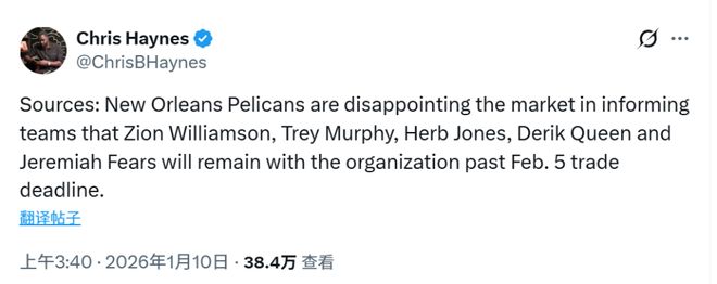 北京时间1月10日,据名记Haynes报道,新奥尔良鹈鹕队已向联盟其他球队明确表示,在2月6日交易截止日(北京时间)前,无意交易锡安-威廉姆森、特雷-墨菲、赫伯特-琼斯、德里克-奎因和耶利米-费尔斯。