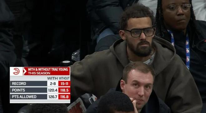 但防守端差距惊人:特雷·杨在场时,球队场均失分高达126.7分;缺阵时,这一数字骤降至116.8分。综合净效率计算,特雷杨带来的进攻提升远不足以弥补防守端的崩盘。简单来说,特雷杨是“杀敌一千,自损两千” 他个人华丽数据掩盖不了球队整体的负面影响。这也解释了为何老鹰在本赛季早期表现挣扎,却在特雷杨缺阵期间打出更好战绩。老鹰管理层的决定,或许正是基于这些数据。