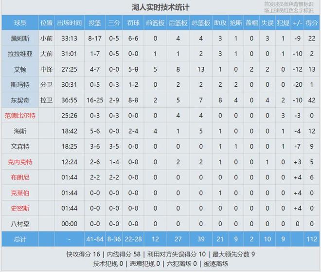 德罗赞32分2板6助3断、蒙克26分8助、威少22分5板7助,正负值+10全场第二。威少和蒙克,两个湖人旧将联手投进11记三分,湖人全队三分36中8!东契奇空砍42分7板8助4断、詹姆斯22分4板3助。湖人三连败,最后看看数据:
