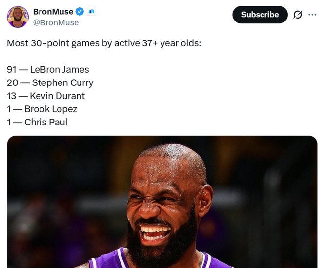凭借这样的表现,詹姆斯41岁后出战7场比赛,就成功占据NBA历史41岁后得分榜前7中的6席,也再度刷新由自己保持的NBA历史最老单场30+纪录。