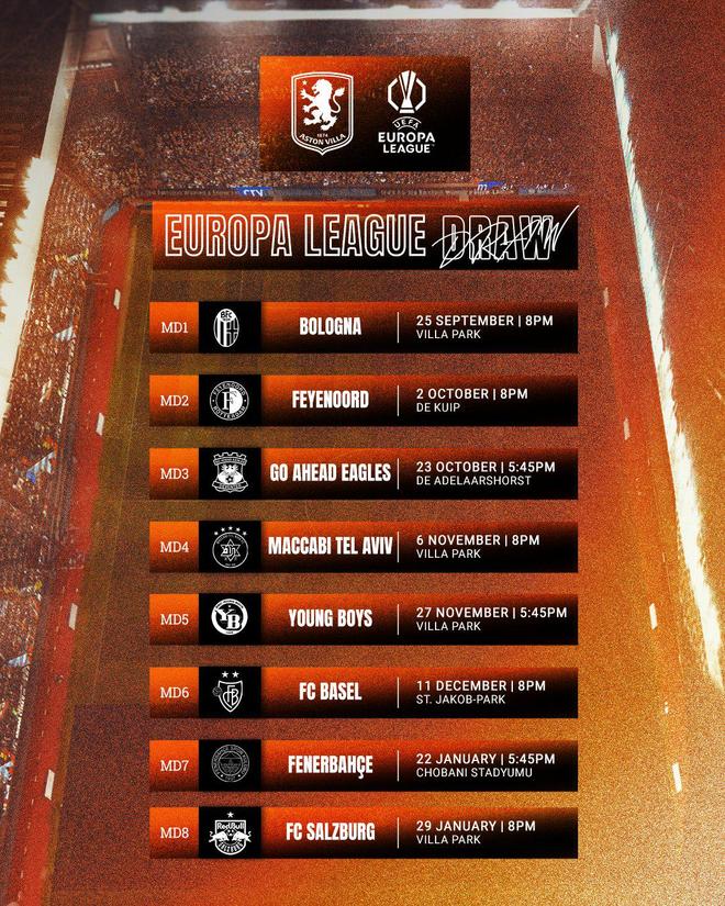 雷速体育8月31日宣 本赛季欧联杯联赛阶段赛程已经公布。根据赛程,阿斯顿维拉首轮将在9月26日主场迎战博洛尼亚,末轮将在1月30日主场迎战萨尔茨堡红牛。