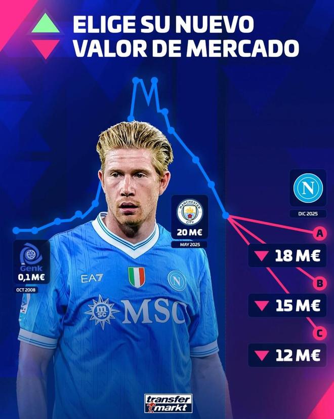 北京时间12月19日,在即将更新意甲球员身价的情况下,德转对目前效力于那不勒斯的德布劳内进行了身价预热,他们给出了三个选项,全部都为下跌,最低跌至1200万欧元。