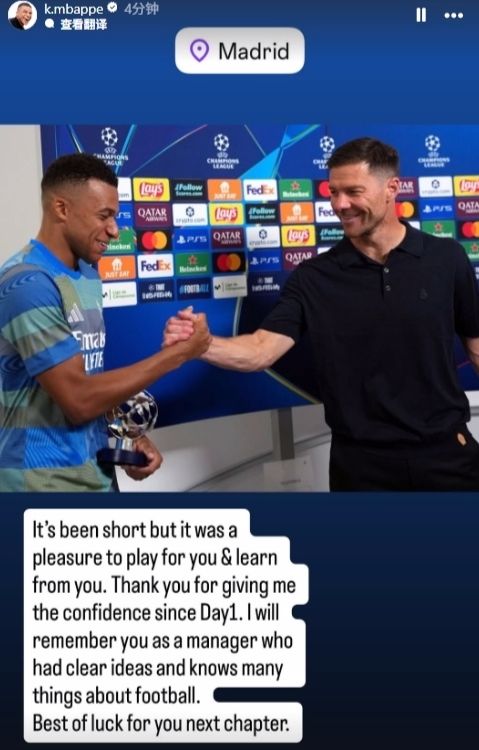值得注意的是,姆巴佩是首位发文的皇马球员。姆巴佩晒出与阿隆索的握手照写道:“虽然时间短暂,但能为您效力并向您学习,我感到非常荣幸。感谢您从一开始就给予我的信任。我会永远记住您是一位思路清晰、对足球了如指掌的教练。祝您在人生的下一个阶段一切顺利。”