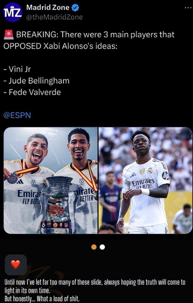 ESPN爆料,据阿隆索身边人士透露,阿隆索对部分关键球员在场内外的贡献感到失望,更重要的是,有一小部分“有影响力、直言不讳”的球员,并不愿意接受他的战术理念。随后,这位人士直接点出了三个人的名字:维尼修斯、贝林厄姆和巴尔韦德。他们可是皇马当前阵容中,话语权最重的三类代表:锋线王牌、中场新核和更衣室领袖型人物。